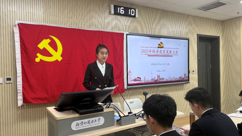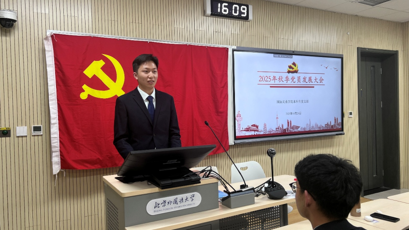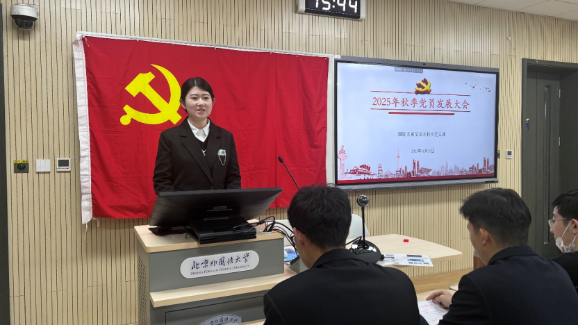 2025年11月28日下午,国际关系学院本科生党支部在国际大厦431教室召开2025年秋季党员发展大会。会议由本科生党支部书记张顾子煊主持,国际关系学院党总支副书记彭澍出席并讲话,支部全体党员、发展对象和部分积极分子参加大会。